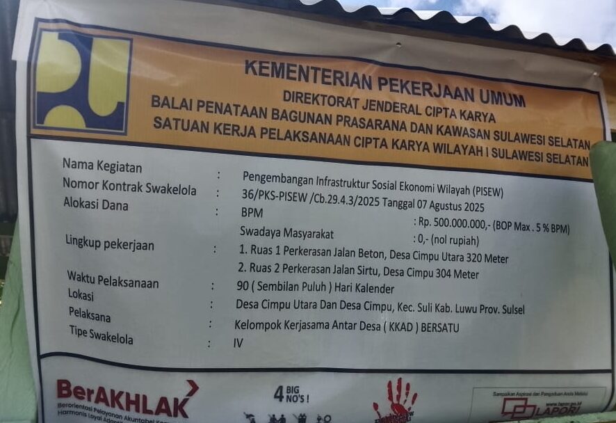 LUWU- Pengembangan Infrastruktur Sosial Ekonomi Wilayah (PISEW) berupa pembangunan jalan beton dan jalan sirtu di Desa Cimpu Utara dan Desa Cimpu, Kecamatan Suli menuai sorotan, Rabu (29/10/2025).