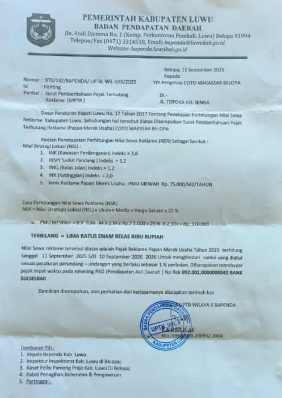 Luwu- Pedagan atau pengelola usaha di Kabupaten Luwu keluhkan sewa reklame. Keluhan itu disampaikan oleh seorang pengelola makanan khas Makassar (Coto Makassar) setelah ia menerima surat pemberitahuan Pajak Terhutang dari Badan Pendapatan Daerah (Bapenda) Kabupaten Luwu pada 11 September 2025.