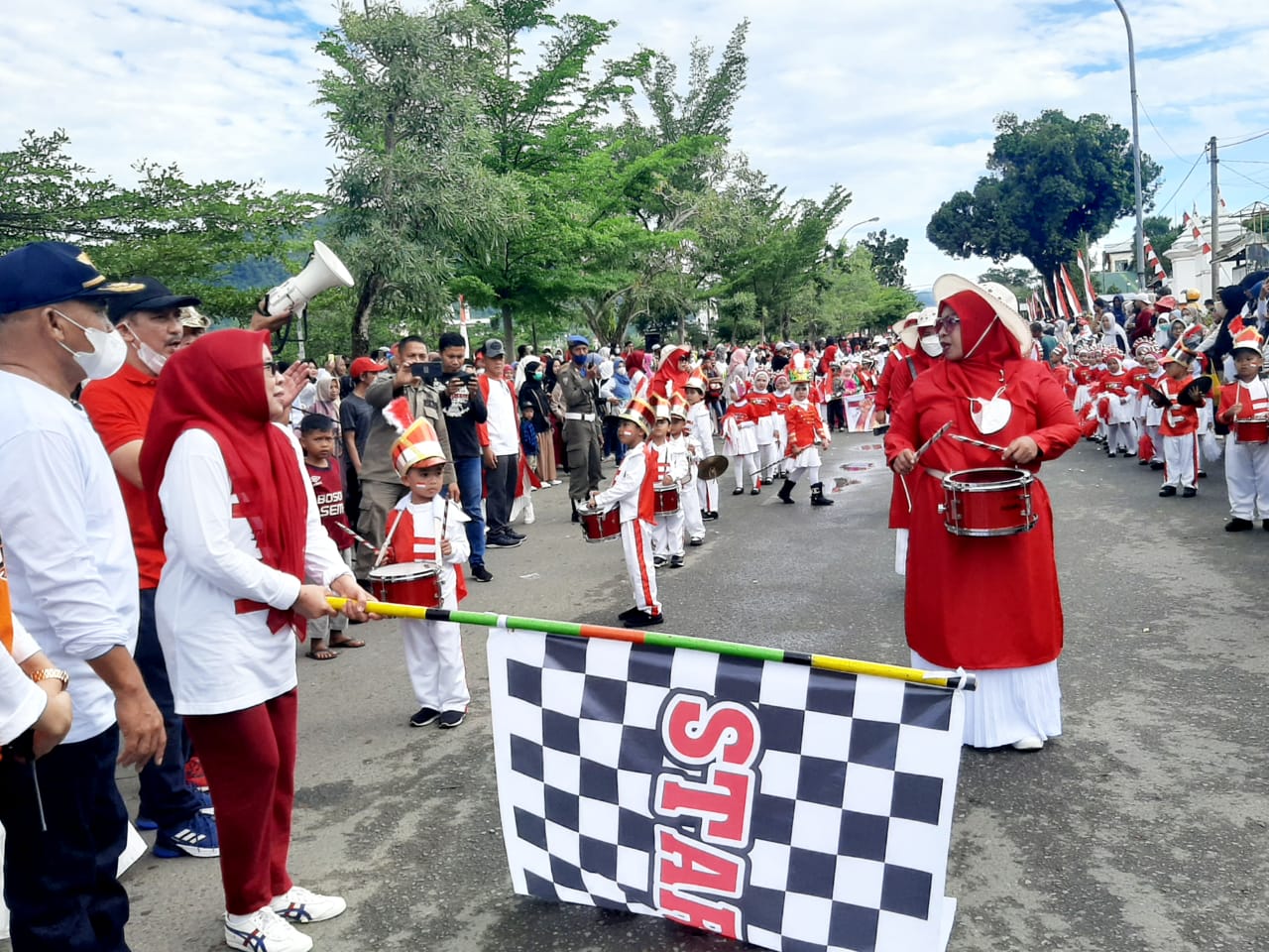 PALOPO – Ketua TP PKK Kota Palopo, yang juga adalah Bunda PAUD Kota Palopo, Utia Sari Judas melepas peserta Karnaval tingkat TK dan SD, dalam rangka memeriahkan HUT Ke-77 Kemerdekaan RI di Lapangan Gaspa Kota Palopo, Sabtu (13/08/2022).