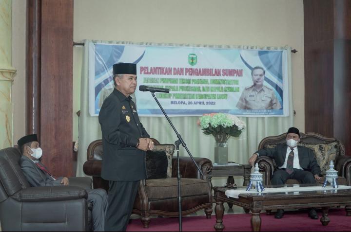 BELOPA— Sesuai dengan Surat Keputusan (SK) Bupati Luwu, Nomor 821.20/109/BKPSDM/2022 tertanggal 26 April, Basmin Mattayang melantik sejumlah pejabat Pimpinan Tinggi Pratama dan Pejabat Administrasi di rumah jabatannya di Kelurahan Pammanu, Kecamatan Belopa Utara, Selasa (26/04/2022).