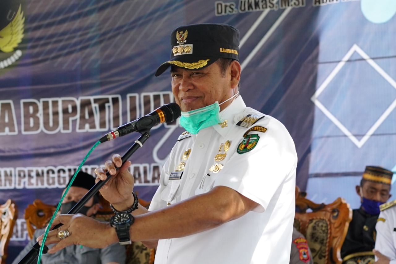 BELOPA — Bupati Luwu, Basmin Mattayang meresmikan penggunaan jalan poros Padang Sappa – Noling di depan lapangan sepakbola Andi Tadda, kelurahan Noling Kecamatan Bupon, Kamis (11/6/2020).