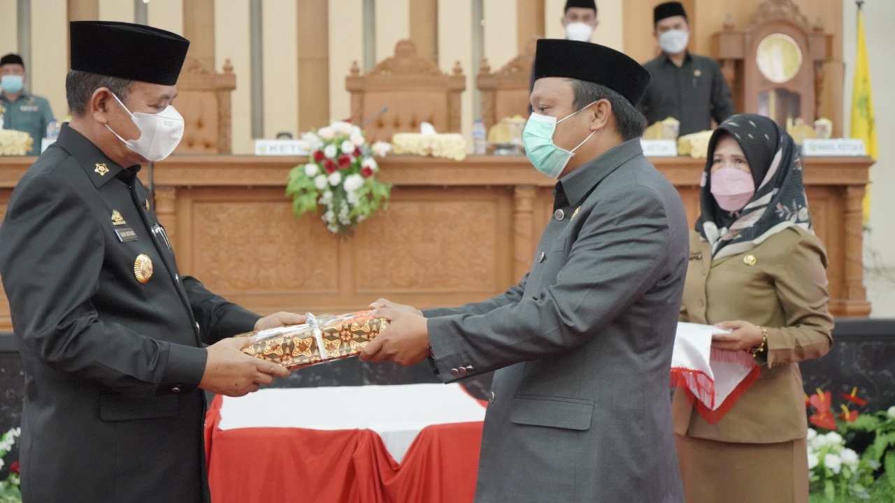 BELOPA — Bupati Luwu, Dr H Basmin Mattayang menyerahkan 2 (dua) jenis Rancangan Peraturan Daerah (Ranperda), yakni Ranperda Perubahan RPJMD Kabupaten Luwu Tahun 2019-2024 dan Ranperda tentang Rencana Induk Pariwisata Daerah (Riparda) dalam Rapat Paripurna DPRD, Kantor DPRD Luwu, Kelurahan Senga Kecamatan Belopa, Selasa (23/3/2021).