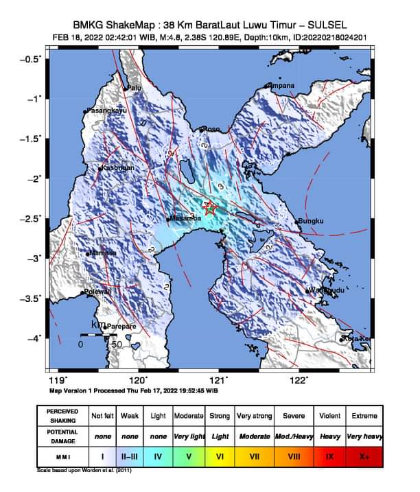 MALILI — Sebuah gempa bumi berkekuatan 4,8 Skala Richter (SR) mengguncang Kabupaten Luwu Timur, Jumat (18/02/2022) sekitar pukul 03.42 WITA dinihari tadi. Gempa tersebut berlokasi di 2,38 Lintang Selatan dan 120,89 Bujur Timur berjarak 38 kilometer Barat Laut Luwu Timur dengan kedalaman 10 kilometer.