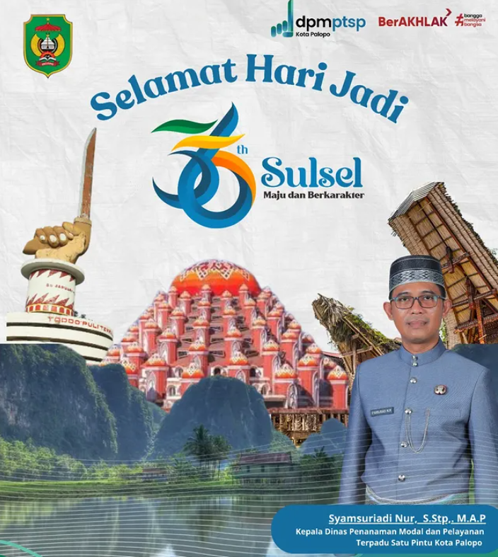 PALOPO — Kepala Dinas Penanaman Modal dan Pelayanan Terpadu Satu Pintu (DPMPTSP) Kota Palopo, Syamsuriadi Nur menyampaikan ucapan selamat memperingati Hari Jadi ke-356 Provinsi Sulawesi Selatan, yang dirayakan pada tanggal 19 Oktober.