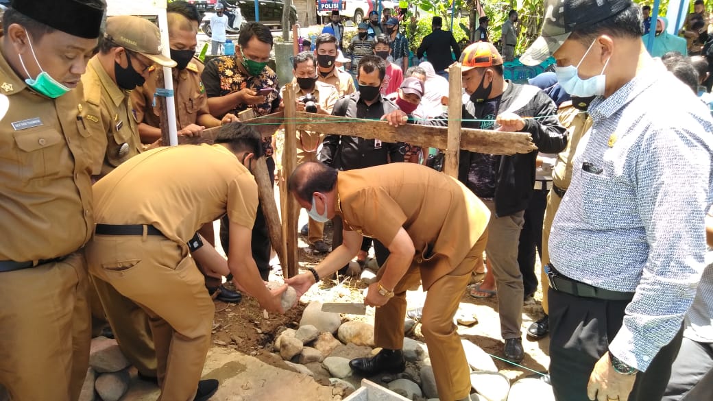WALMAS — Bupati Luwu, Basmin Mattayang, melakukan peletakan batu pertama pembangunan bantuan rumah tinggal untuk korban banjir di Desa Pompengan Utara, Kecamatan Lamasi Timur, Selasa (20/10/2020).