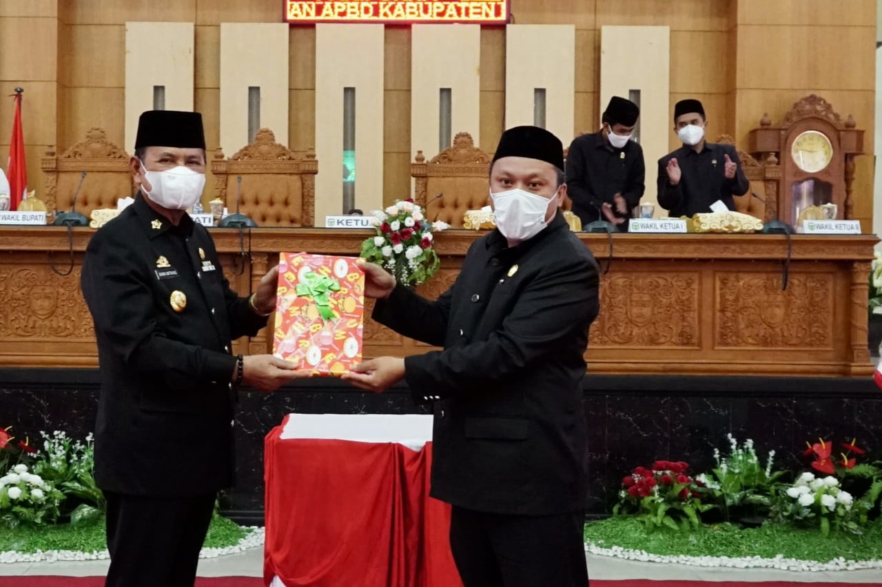 BELOPA — Ketua DPRD Luwu, Rusli Sunali, S.Pd menyerahkan surat penetapan keputusan bersama penetapan Peraturan Daerah Pertanggungjawaban Pelaksanaan Anggaran Pendapatan dan Belanja Daerah (APBD) Kabupaten Luwu tahun 2020 kepada Bupati Luwu, Dr H Basmin Mattayang pada rapat paripurna di DPRD Luwu, Kamis (29/7/2021).