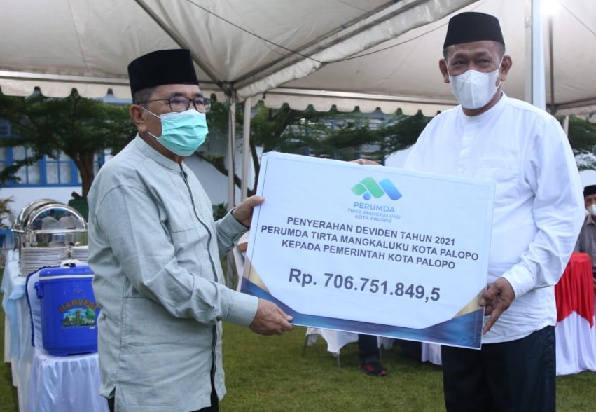 PALOPO — Perumda Air Minum Tirta Mangkaluku Kota Palopo menggelar buka puasa bersama sekaligus penyerahan deviden tahun 2021 ke Walikota Palopo, HM Judas Amir, Selasa (26/4/2022).